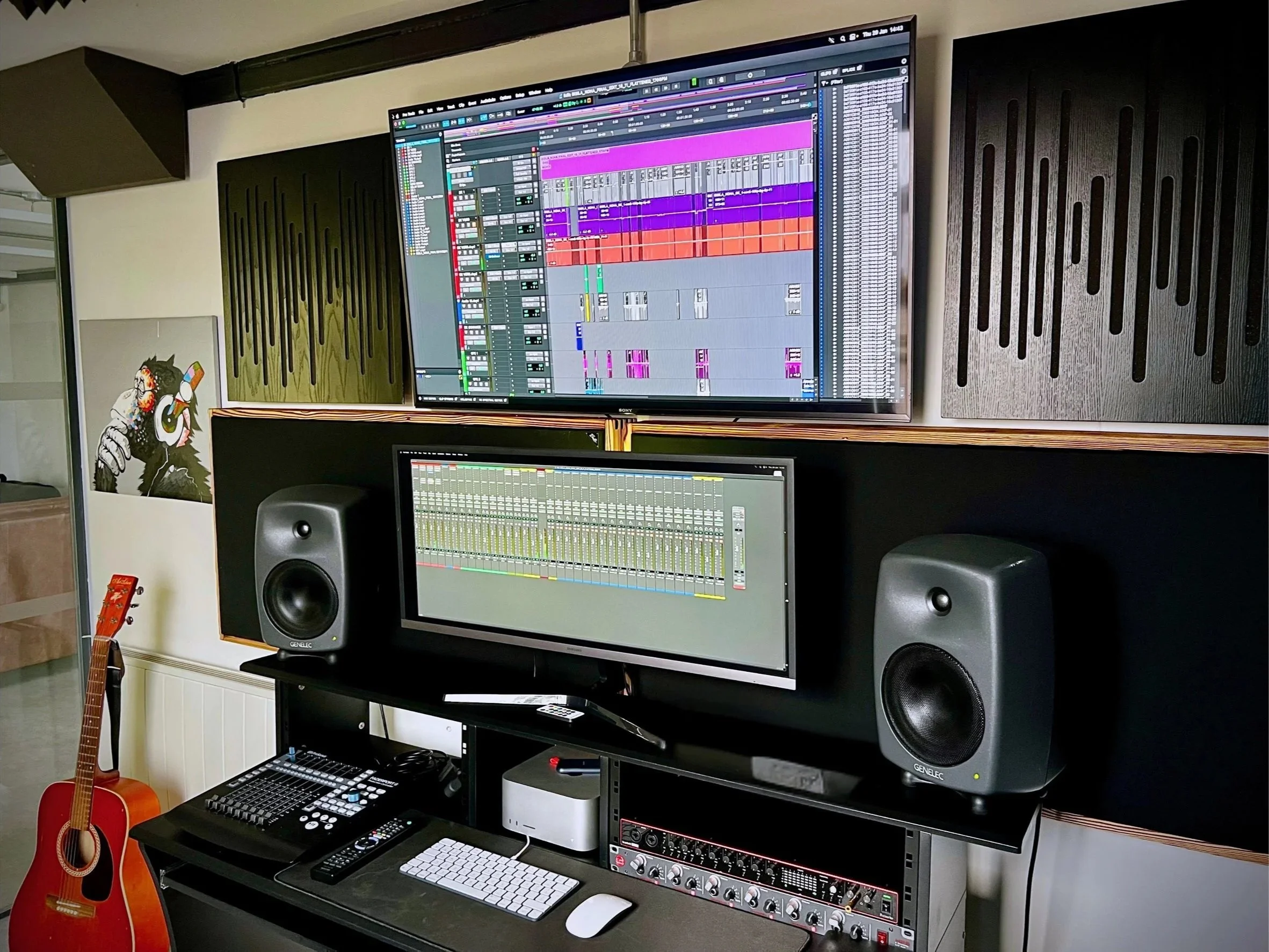 With a post production studio at our new offices on the banks of the river Thames, we can record on location and then edit and mix afterwards to take your project from production to post in one neat package. We can also compose bespoke arrangements for your film, do sound design, sonic branding and VO.